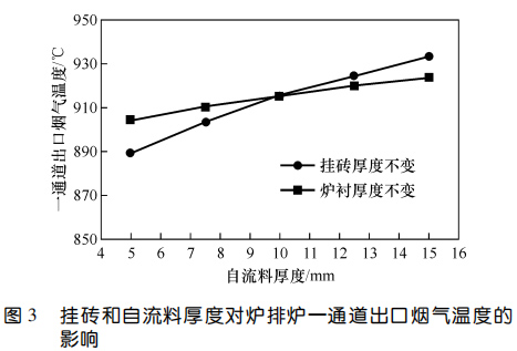 2、對于掛磚+自流料爐襯,掛磚厚度不變時(shí),自流料厚度越大,一通道出口煙氣溫度越高;爐襯總厚度不變時(shí),掛磚越厚、自流料層越薄,一通道出口煙氣溫度越低;爐襯各工作層厚度固定時(shí),一通道出口煙氣溫度隨自流料熱導(dǎo)率的升高而降低,通過調(diào)整自流料熱導(dǎo)率,一通道出口煙溫差值可達(dá) 70 ℃。