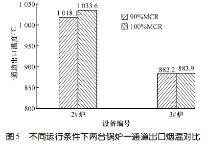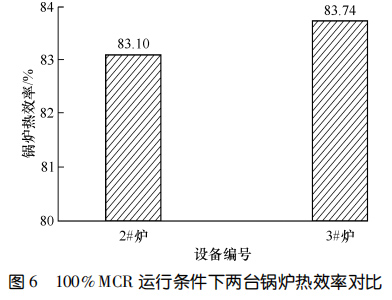 兩臺(tái)設(shè)備運(yùn)行 11 個(gè)月后進(jìn)行了能效測試。圖5對比了 90%鍋爐大的連續(xù)蒸發(fā)量(簡稱 MCR)和MCR 條件下鍋爐一通道的出口煙溫。圖6示出了MCR運(yùn)行條件下兩臺(tái)鍋爐熱效率的對比。結(jié)果顯示:在 90%MCR 運(yùn)行條件下,3#爐一通道出口煙溫比2#爐低 135.9 ℃,在MCR 運(yùn)行條件下,3#爐一通道出口煙溫比 2#爐低 149.7 ℃,3#爐的熱效率比 2#爐高 0.64%。相較而言,使用膜式壁爐襯的3#爐在負(fù)荷相當(dāng)?shù)那闆r下,余熱鍋爐熱效率更高。