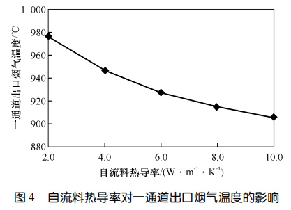 SiC 自流料熱導(dǎo)率對一通道出口煙氣溫度的影響圖4示出了自流料熱導(dǎo)率對一通道出口煙氣溫度的影響??梢钥闯?,爐襯各工作層厚度固定時(shí),一通道出口煙氣溫度隨自流料熱導(dǎo)率的升高而降低。通過調(diào)整自流料熱導(dǎo)率,一通道出口煙氣溫度差值高達(dá) 70 ℃。