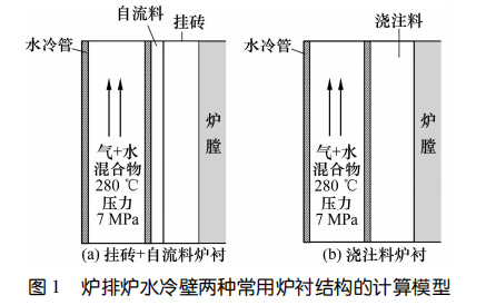 國內(nèi)外爐排爐在水冷壁內(nèi)襯結(jié)構(gòu)設(shè)計(jì)上有較大差別,國外爐排爐水冷壁內(nèi)襯結(jié)構(gòu)為鰭片(扁鋼)掛釘+SiC掛磚+SiC自流料填充密封,簡稱膜式壁結(jié)構(gòu);國內(nèi)則為水冷管錨固釘+SiC澆注料結(jié)構(gòu)。不同的爐襯材質(zhì)和結(jié)構(gòu)對水冷壁內(nèi)襯傳熱有較大影響,目前尚未見爐排爐水冷壁內(nèi)襯熱傳導(dǎo)研究報(bào)道。
