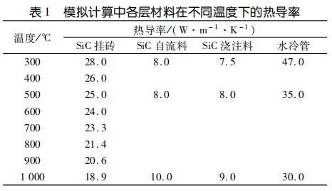水冷壁內(nèi)襯的熱傳導(dǎo)性能需要與爐況相匹配,既要盡可能多地將熱量傳導(dǎo)出去發(fā)電,又要保證一通道出口溫度不低于 850℃。模擬計(jì)算設(shè)定耐火材料熱導(dǎo)率恒定,暫不考慮使用過程中耐火材料組成變化對熱導(dǎo)率的影響和爐襯表面積灰對爐襯熱傳導(dǎo)的影響也不考慮掛釘和錨固釘對熱傳導(dǎo)的影響。進(jìn)行模擬計(jì)算時(shí),水冷壁內(nèi)襯各工作層選取的熱導(dǎo)率見表1。