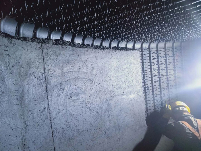 考慮到以上磨損的特點(diǎn)、耐磨材料的物理性能及施工特點(diǎn),一般采用單層或多層耐磨耐火材料的敷設(shè)。單層敷設(shè)的部位包括水冷壁、屏式受熱面、水冷隔墻、雙面水冷壁、汽冷分離器等薄襯里處,用φ6或 φ10 的圓柱銷釘( 或 Y 型 V 型銷釘) 將耐磨耐火澆注料支撐在管壁煙氣側(cè)。薄襯里更能經(jīng)得起鍋爐起停時(shí)的快速熱沖擊,同時(shí), 為增強(qiáng)其剛性及沖擊能力,需在澆注料中增加不銹鋼纖維。厚襯里分為兩層或三層,煙氣側(cè)為耐磨耐高溫的耐磨耐火磚砌筑或耐磨可塑料澆注而成, 內(nèi)襯的保溫材料目的是減少熱損失,降低殼體溫度。