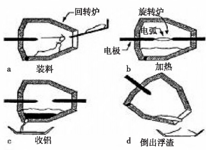 ALUREC法由丹麥阿加公司、霍戈文斯鋁業(yè)公司、曼公司三家公司聯(lián)合開發(fā),流程圖見圖4。主要流程為裝料、加熱、收鋁、倒出浮渣,該法主體設(shè)備為回轉(zhuǎn)式熔化爐,還可以用純氧作助燃劑,升溫速度快,可以有效減少燃燒過程產(chǎn)生的有機氣體,煙塵被煙罩吸收二次利用處理。此法優(yōu)點在于機械化程度較高和運行環(huán)境好;但金屬回收率要比炒灰低,一般在93%左右,且產(chǎn)生的殘余鋁灰還需進一步處理。