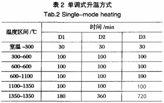 將原料放在共磨機中以料:球:水重量比1:1:1濕法共磨,轉速為300rpm。研磨時間為24小時,將共磨后的物料在直徑為30mm,高為50mm的圓柱形模具中成型。成型試樣在110℃干燥箱中烘干24小時,然后進行熱處理。試樣在空氣中自然干燥48小時后脫模。把工業氧化鋁配好的混合料進行了DSC-TG和大試樣熱重分析,以此判定無煙煤的燒失溫度和莫來石化的開始溫度。為進而制定合理的熱處理制度提供依據。比較了兩種煅燒制度對莫來石轉化率的影響:一為單調升溫,然后保溫;另一為在高低兩個溫度分段保溫。如表2、表3。按相關標準檢測了燒后試樣的體積密度、顯氣孔率。